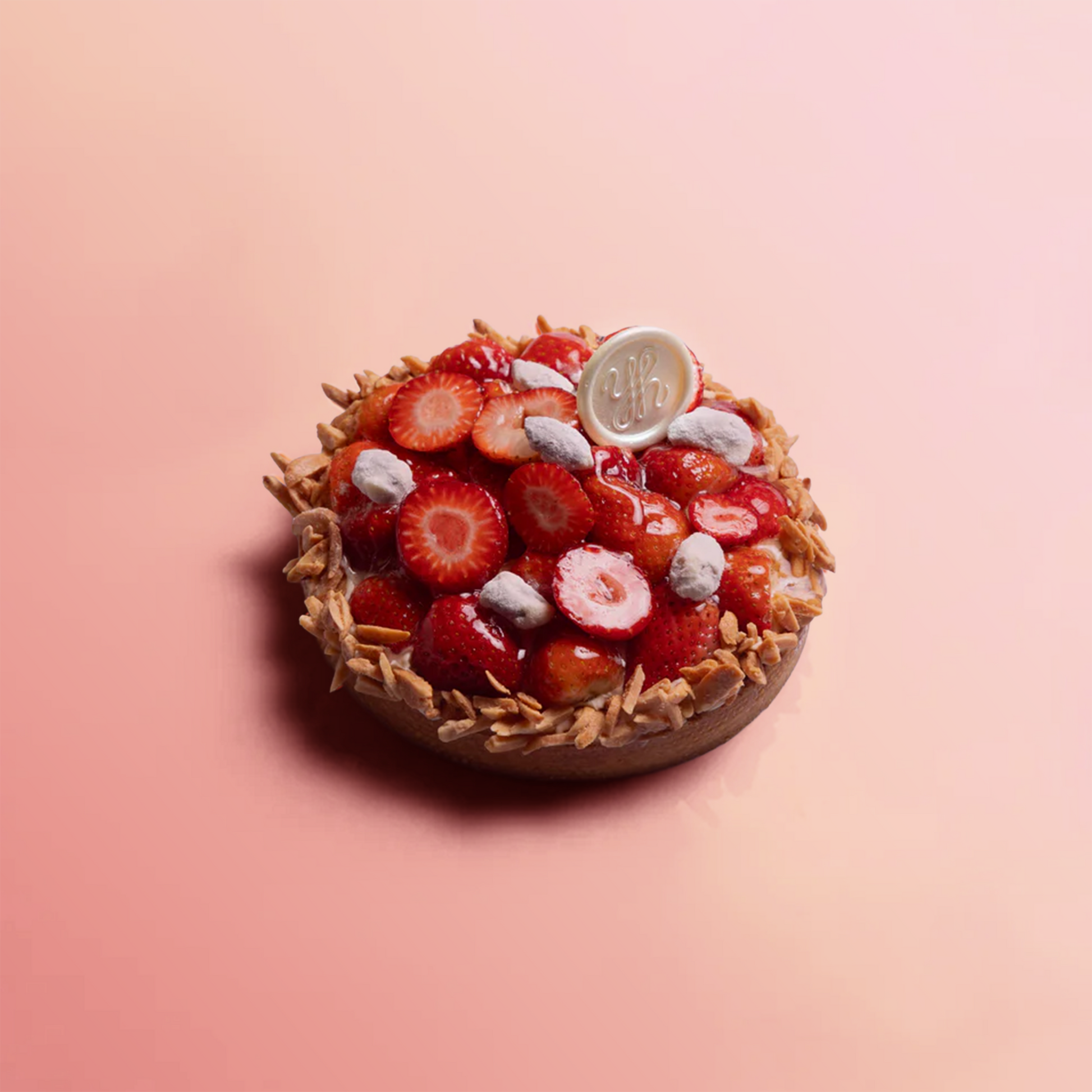 Ingredients: Premium Strawberries, Strawberry Confit, Vanilla White Choc Whipped Ganache, Candied Almonds, Almond Frangipane, Sable Tart Shell.