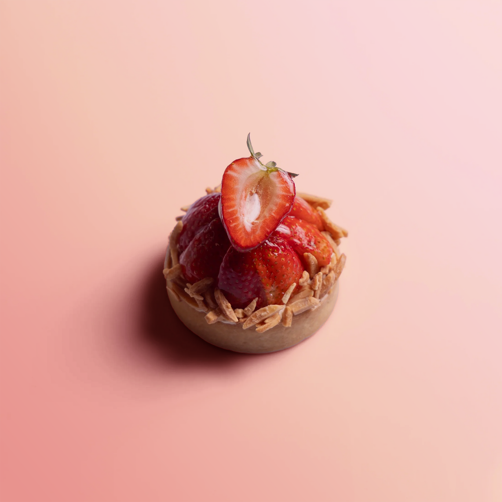 Ingredients: Premium Strawberries, Strawberry Confit, Vanilla White Choc Whipped Ganache, Roasted Almonds, Almond Frangipane, Sable Tart Shell.
