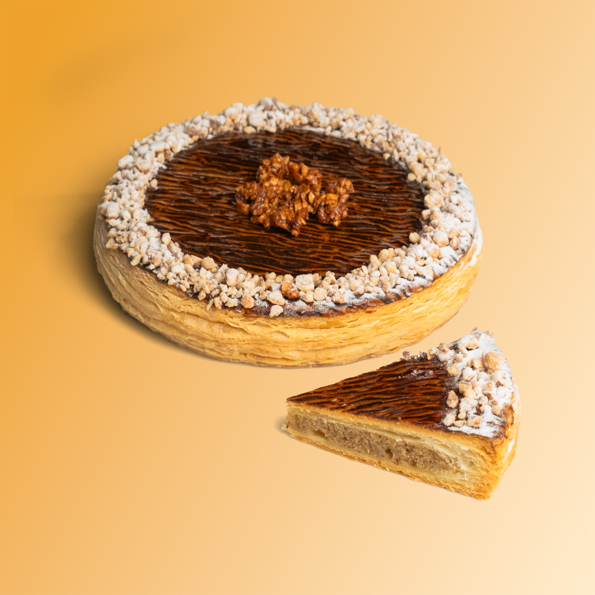 Our Galette des Rois features flaky puff pastry, filled with hazelnut frangipane, topped with crushed hazelnut and more caramelised hazelnut. A traditional French cake, carefully made and modernly presented. Each galette comes with a fève and a crown to honour the tradition.