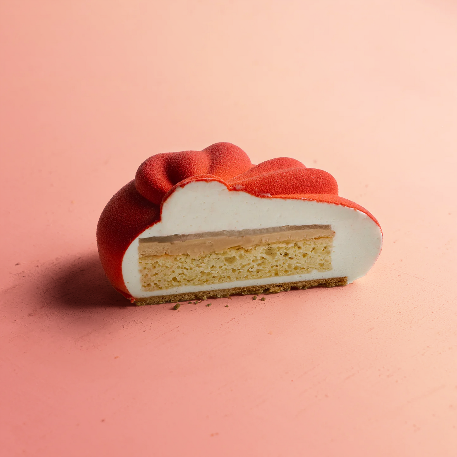 Ingredients: Lychee Mousse, Rose Cremeux, Champagne Jelly, Almond Joconde, Sable.
