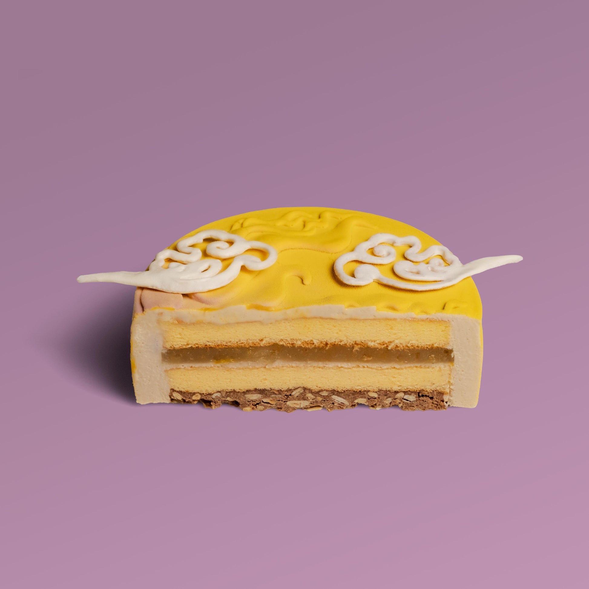 Jasmine green tea mousse, light and floral, surrounds a pomelo & grapefruit compote that shines with citrus brightness. A layer of sunflower seed crumble adds warmth and texture, resting on soft chiffon sponge.
