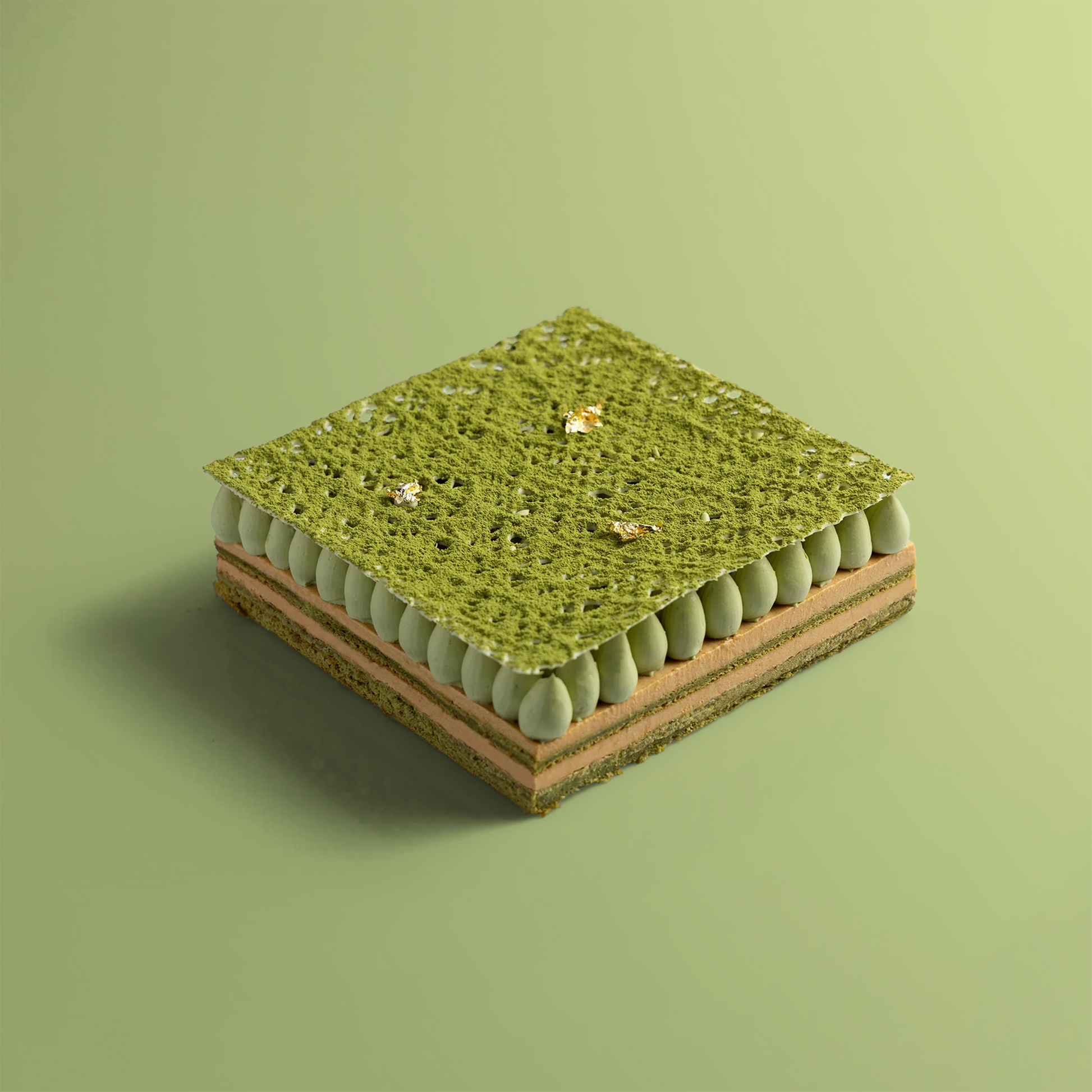 Finished with matcha whipped ganache and a delicate white chocolate net, dusted in Furuta matcha.